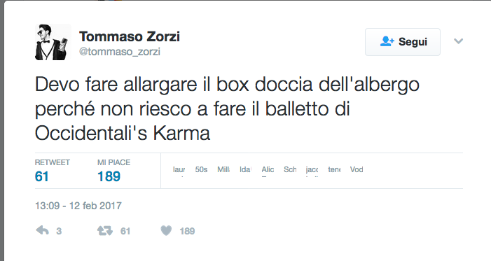 Piaccia o meno la canzone è già entrata nel repertorio nazional popolare tra chi ne coglie l’acuta intelligenza, chi ne apprezza la ballabilità, chi aspetta di urlare Namastè e chi coglie l’occasione per travestirsi da scimmia e approfittare della propria ora d’aria e di gloria per mettersi in fila indiana e ballare Occidentali’s karma. Perchè ha proprio ragione Gabbani: “La folla grida un matra, la folla inciampa… Occidentali’s karma”