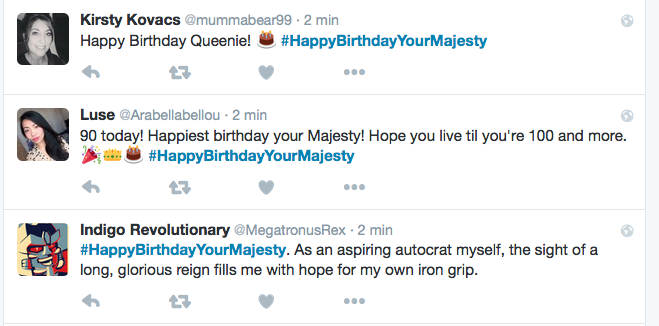 Ecco che allora chi non è potuto esserci a Windsor dove la sovrana e il marito Filippo stanno festeggiano ha inviato il suo #HappyBirthdayYourMajesty tramite social network.