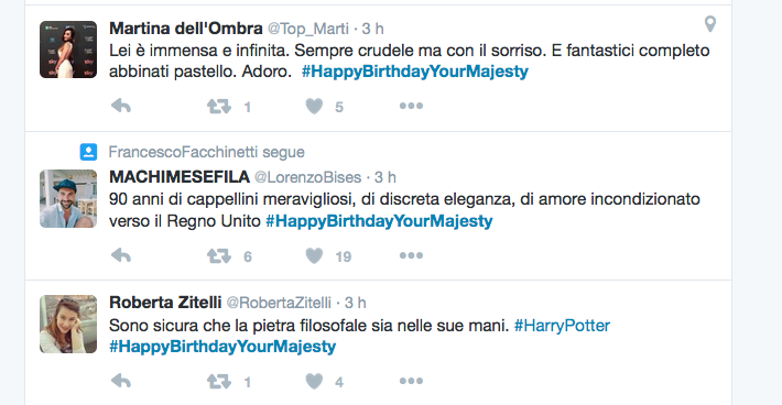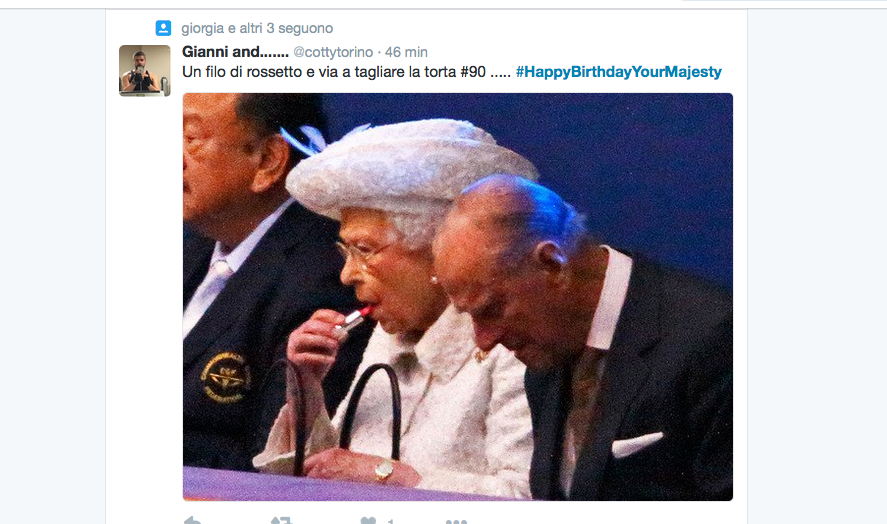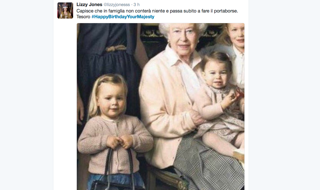 Twitter, in particolare, per tutto il giorno è stato bacheca di auguri arrivati da ogni angolo del pianeta. Tra il devoto, l’ironico e il divertito il mondo dell’uccellino blu si è stretto intorno alla Sovrana, “l’ultima vera donna politica d’Europa”, scrive qualcuno. “La mia nonna ideale”, aggiunge un altro. “Elisabetta sì che ha gli attributi” chiosa un terzo” e aggiunge un quarto: “Se incontrate una vecchina con il velo in testa che guida un Land Rover fatele gli auguri. E’ la Regina e compie gli anni”.