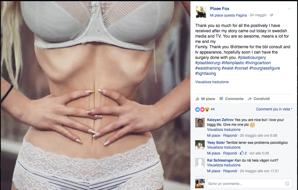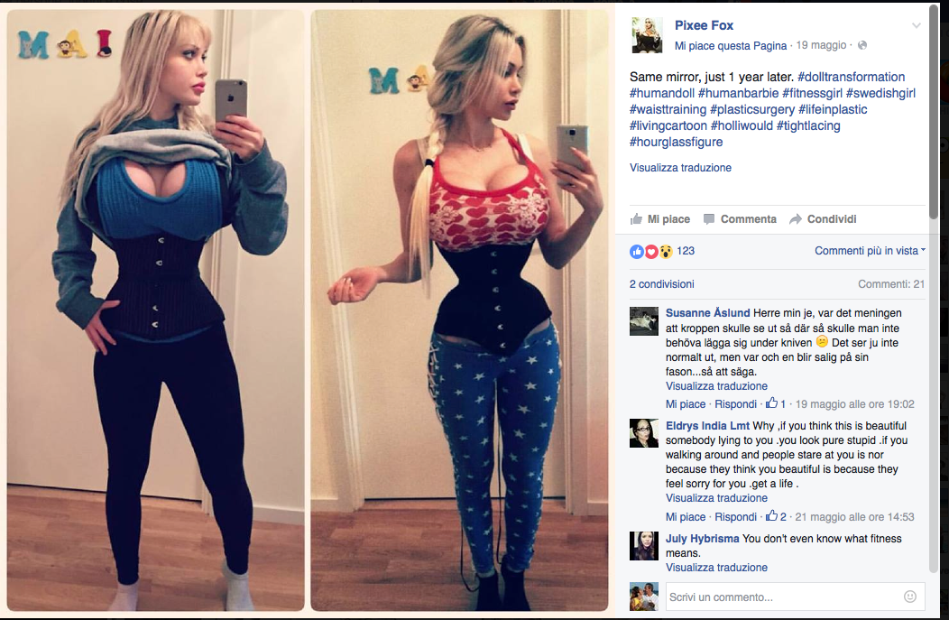 Come se tutto ciò non bastasse per mantenere le sembianze del cartoon Pixee vive con un corsetto che le modella la vita e si nutre solo di cibi liquidi: proteine o carboidrati che siano. Tanta devozione alla causa l’è valsa l’ingresso nel libro dei Guinness dei Primati come bambola viventi e a suon di like la Jessica Rabbit svedese sta facendo una fortuna.