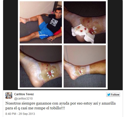 LA CAVIGLIA DI TEVEZ – E alla fine si è fatto sentire anche Carlitos Tevez, uno dei protagonisti del pomeriggio dell’Olimpico. Prima un tweet per raccontare la felicità per la vittoria nel primo derby torinese della sua carriera e poi, in serata, le foto della caviglia martoriata dopo l’intervento di Immobile con un messaggio polemico: “Noi sempre vinciamo con un aiuto, è per questo che adesso sto così. E solo un giallo per quello che quasi mi ha rotto la caviglia…”. A chi tocca adesso?