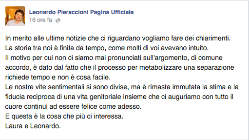 “La storia tra noi è finita da tempo, come molti di voi avevano intuito”. Comincia così il messaggio ufficiale di Leonardo Pieraccioni e Laura Torrisi che mette fine alla storia d’amore tra il regista e l’attrice. Dopo lo scandalo della pubblicazione dei selfie che testimoniano il tradimento di Laura Torrisi ai danni del padre di sua figlia, via Facebook arriva la presa di posizione definitiva: “In merito alle ultime notizie che ci riguardano vogliamo fare dei chiarimenti” scrive la ormai ex coppia che poi spiega: “Il motivo per cui non ci siamo mai pronunciati sull’argomento, di comune accordo, è dato dal fatto che il processo per metabolizzare una separazione richiede tempo e non è cosa facile”.