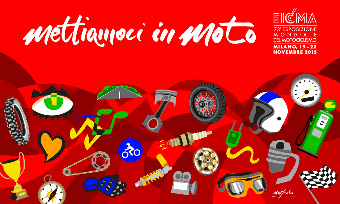 L’artista piemontese firma il visual della nuova campagna pubblicitaria internazionale dell’Esposizione Mondiale del Motociclismo, che si terrà a Milano dal 17 al 22 novembre. “Mettiamoci in moto” è il claim che accompagna le immagini vivaci e turbinose e che suona come invito giocoso agli amanti delle due ruote ma anche come stimolo dai significati più profondi, un’esortazione al settore motociclistico che ha stretto i denti andando avanti e proponendo nuovi modelli e tecnologie.