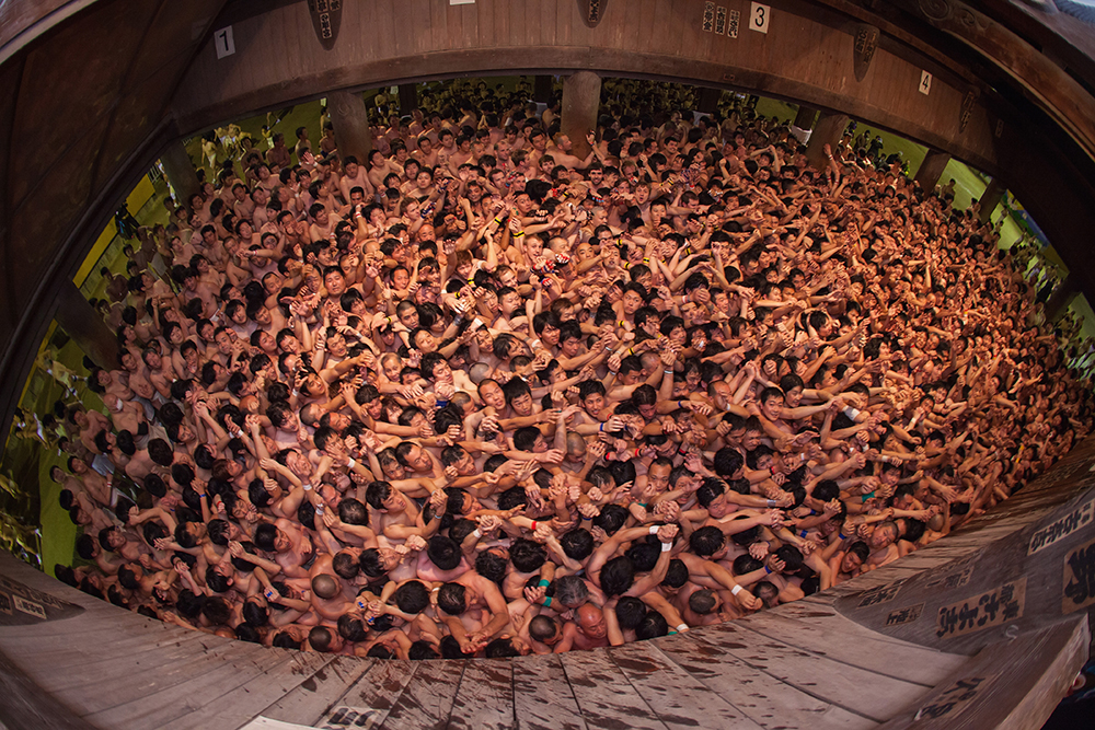 Il RITO: Dopo aver trascorso alcuni giorni in isolamento e preghiera, i partecipanti si dirigono correndo verso il tempio, vestiti del solo fundoshi (il tradizionale perizoma) e a piedi nudi, investiti da lanci di acqua ghiacciata. Giunti nel tempio, gli uomini gareggiano – ma aiutandosi a vicenda – per accaparrarsi un ramo a cui sono appesi dei dolci tipici, poi offerti alle divinità. Segue una lotta per conquistare gli shingi, dei pezzetti di legno “portafortuna” lanciati da un celebrante. Chi li conquista è il nuovo Shin-Otoko (Uomo nudo), colui cioè che, completamente denudato, assume il ruolo di assorbire tutta la sfortuna di chi riesce poi a toccarlo.