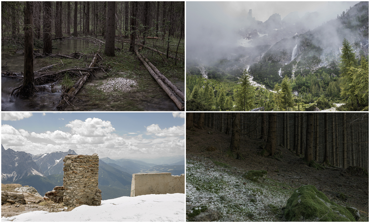 Quasi interamente scattate tra metà maggio e metà luglio (2013 e 2014) negli stessi giorni dell’anno in cui, un secolo prima, De Gasperi scrisse il suo diario, le immagini di Stefano Cioffi immortalano sentieri che vanno verso il nulla, boschi fittissimi, aree isolate avvolte nella nebbia, trasmettendo il senso di alienazione e insensatezza vissuto dai soldati che un secolo fa combattevano in questi luoghi un nemico spesso invisibile, tra “trincee, fortificazioni, sentieri, pendii, foreste, altipiani pietrosi, radure improvvise”.