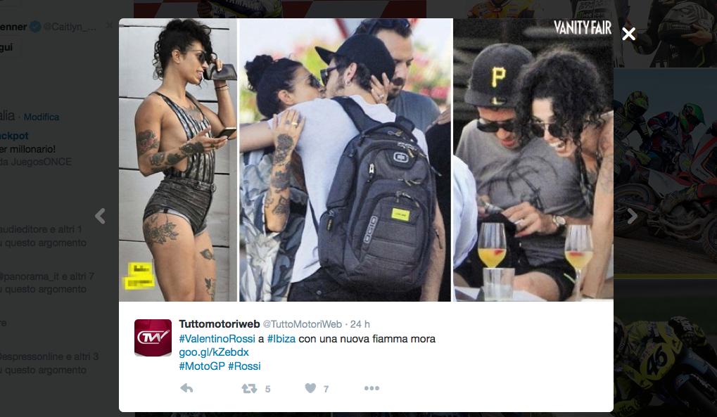 La foto è stata pubblicata da Vanity Fair ed è subito scattata la caccia alla misteriosa ragazza che dopo aver trascorso la giornata con Vale tra scambi di baci e complicità ha salutato il motociclista all’aeroporto mentre lui decollava in direzione dell’Olanda.