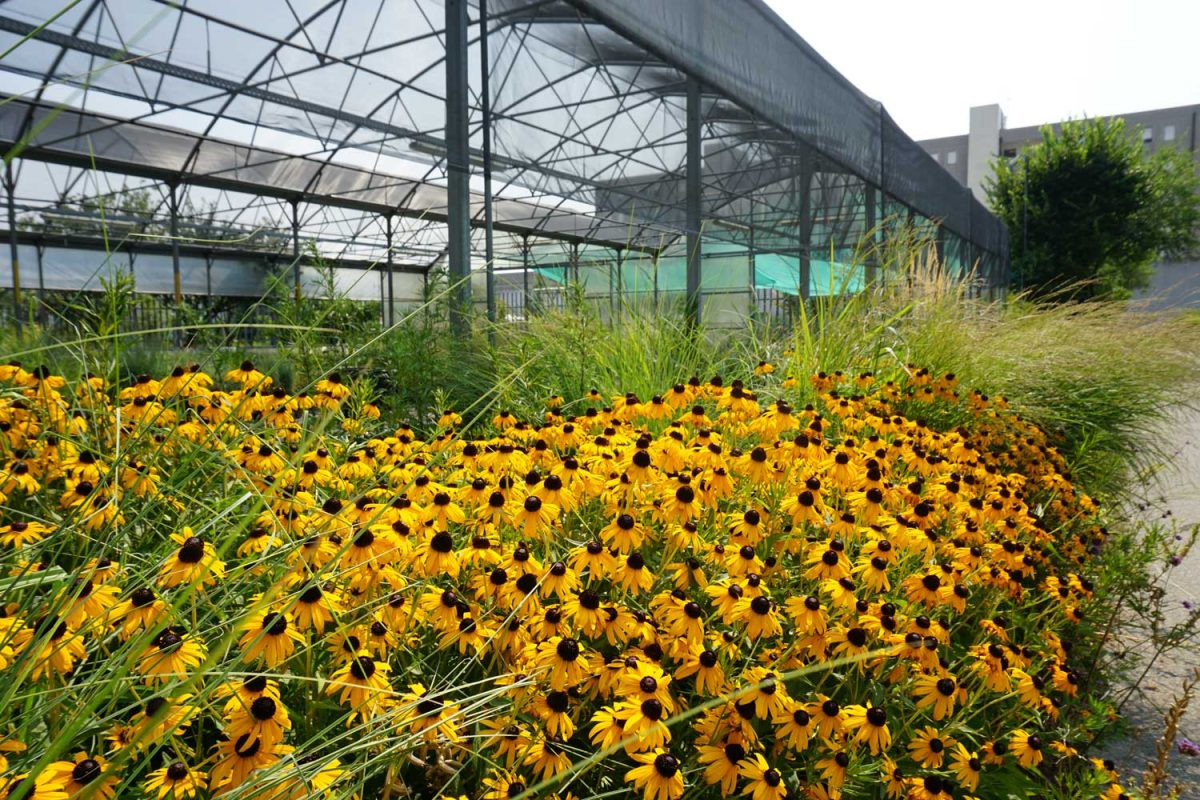 Nell’ombraia e nei tunnel vengono coltivate più di 300 specie di erbacee perenni e di graminacee. In primo piano, Vernonia noveboracensis.