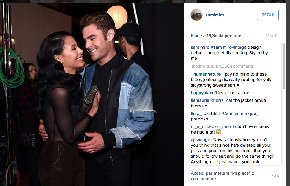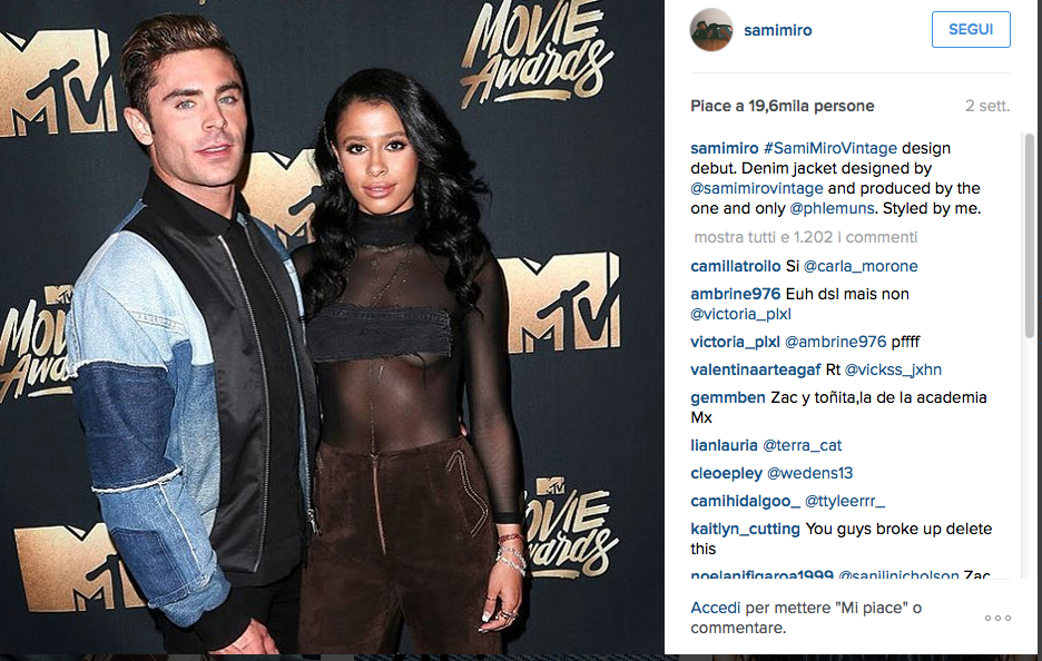 Dopo 2 anni di relazione, però, tra i due è finita. Più dei comunicati fecero gli account di Instagram. Da quello di Efron, infatti, sono sparite tutte le foto con Sami, mentre lei le conserva ancora online.