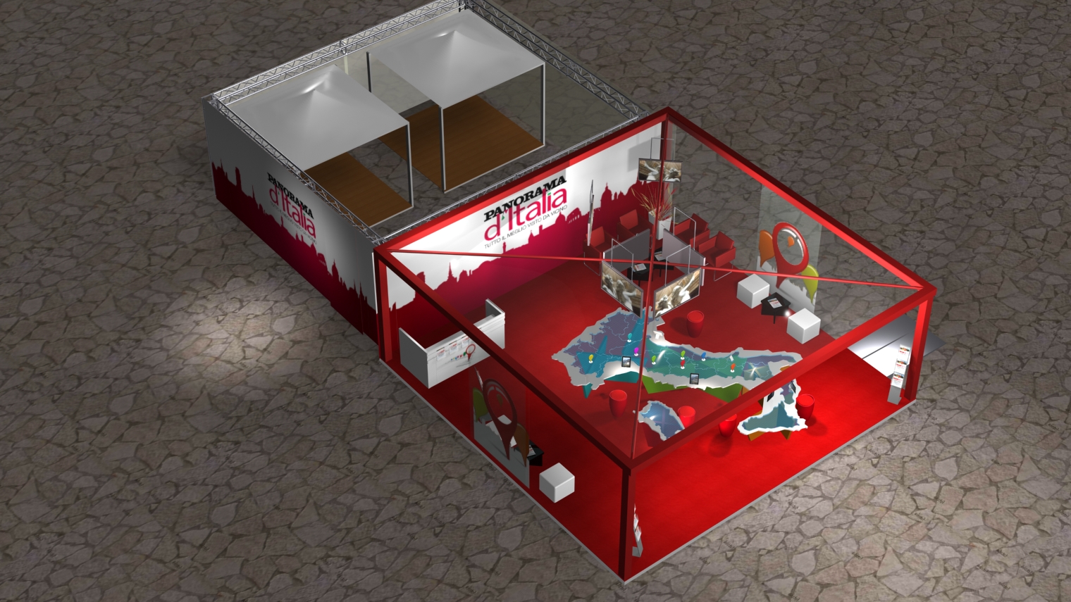 Il quartier generale di Panorama d’Italia è la nuova casa che verrà allestita di volta in volta nella piazza centrale ospitante: una struttura totalmente trasparente che accoglie un grande tavolo con la silhouette dell’Italia.