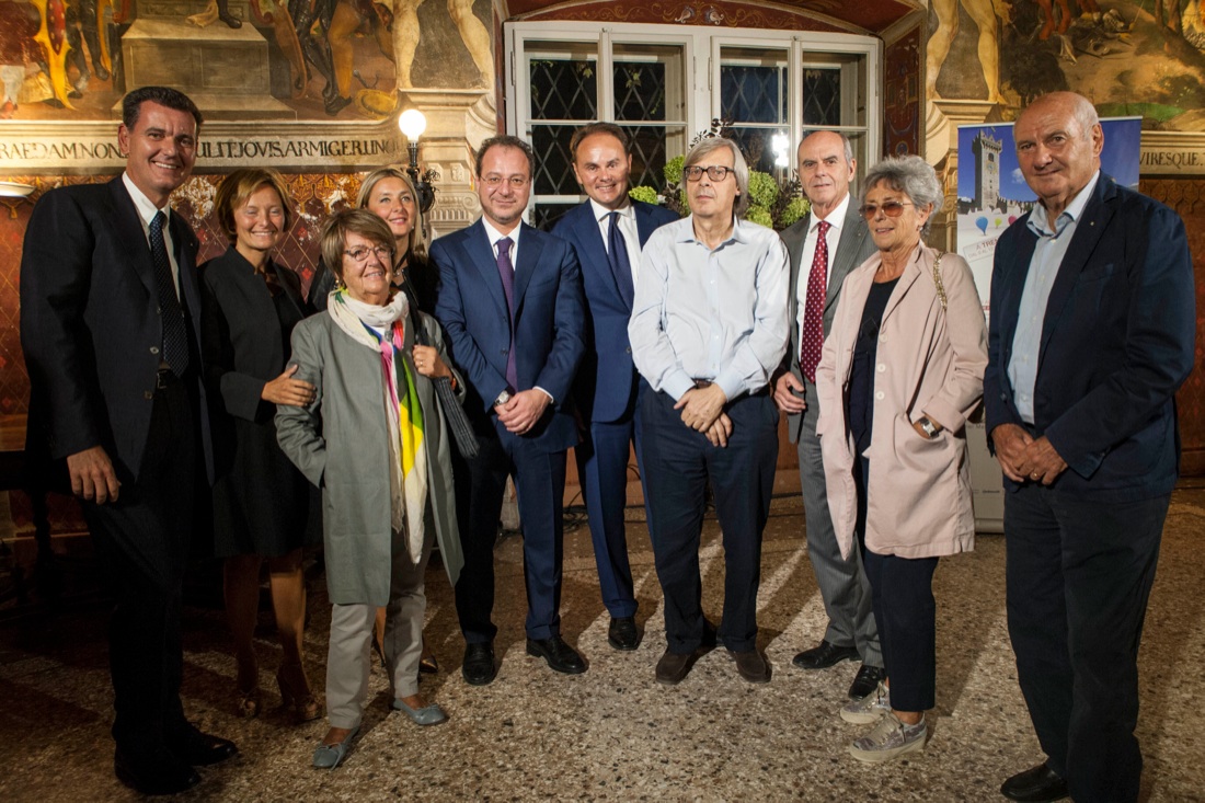 Trento, 9 settembre 2015, Vittorio Sgarbi a Villa Margon con Giorgio Mulè e lafamiglia Lunelli, proprietaria della residenza