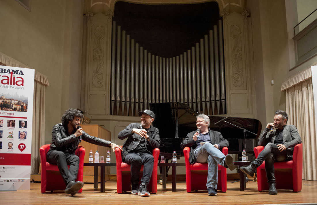 Da sinistra: Francesco Renga, Max Pezzali, il giornalista Gianni Poglio e Nek – 11 maggio 2018