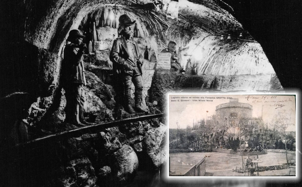 Per 30 anni il signor Lorenzo Gino, falegname di Moncalieri, scavò la roccia per dare sfogo a una sorgente sotterranea che creava gravi problemi di infiltrazioni al suo laboratorio. Tra il 1855 e il 1885 lavorò quotidianamente per far defluire le acque. Alla fine ricavò una serie di tunnel e grotte interconnesse tra loro ed ebbe l’idea imprenditoriale: costruire una «grotta delle meraviglie» per offrire alla gente la possibilità di vivere un’avventura tra creature fantastiche e giochi d’acqua. Così quel canale sotterraneo a serpentina fu arredato dalle sue mani esperte che realizzarono statue e giochi d’acqua, quasi un parco tematico ante litteram dedicato ad episodi della vita dei membri della famiglia Savoia ed a figure mitologiche, nani e putti, al quale si accedeva tramite una barca di legno. Il successo della grotta fu immediato e Gino completò l’opera con un ristorante con camere con il quale campò fino alla morte nel 1902. Nel 1906 il figlio di Lorenzo, Giovanni, visto il grandissimo successo della grotta di Moncalieri, ne costruì una alle porte di Milano, a Sesto San Giovanni. Da poco servita dalla tranvia Milano-Monza, la cittadina era facilmente raggiungibile per una scampagnata nell’anno della grande Esposizione Internazionale al Parco Sempione che attirò un gran numero di visitatori. Anche a Sesto San Giovanni il successo fu notevole. I giornali scrissero delle meraviglie della grotta, il cui ingresso avveniva attraversando un laghetto artificiale che proseguiva all’interno dove statue e giochi d’acqua deliziavano i clienti che potevano usufruire di un ristorante a «prezzi modici» ed un grande solarium ricavato su un terrapieno. Investita dall’urbanizzazione post bellica della città industriale di Sesto, la grotta fu smantellata negli anni Cinquanta. Oggi al suo posto c’è un hotel. A Moncalieri invece, la prima grotta Gino del 1885 esiste ancora ed è sede di un ristorante.