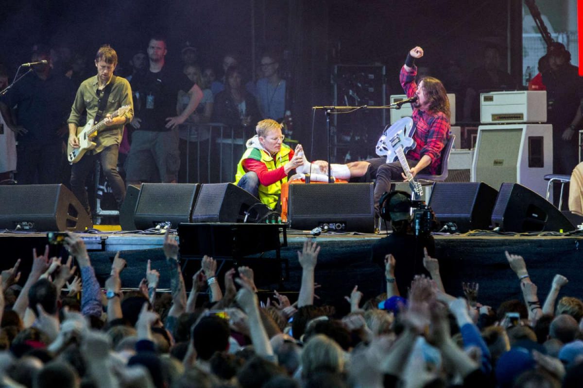 Per uno come Dave Grohl la parola data ha un valore e così, dopo che i suoi compagni hanno portato avanti il concerto deliziando i fan con cover di classici del rock, ritorna trionfalmente sul palco in stampelle durante l’esecuzione di Under Pressure dei Queen. L’immagine del cantante seduto su una sedia con la gamba ingessata appoggiata a uno sgabello, che imbraccia la chitarra e che canta con la consueta grinta, ha fatto il giro del mondo.