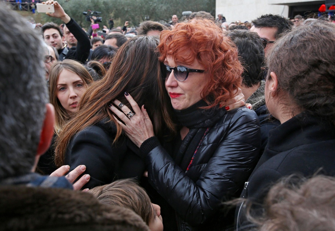 Fiorella Mannoia abbraccia la seconda moglie di Pino Daniele, Fabiola Sciabbarrasi, al termine dei funerali del cantautore al Santuario del Divino Amore, Roma, 7 gennaio 2015