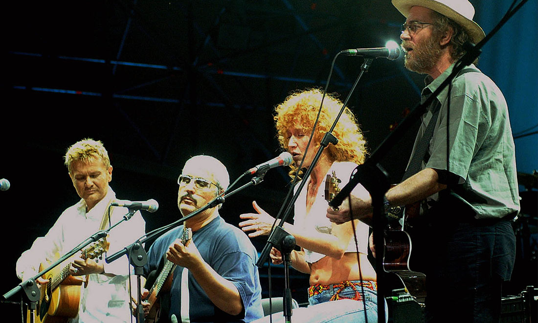 9 luglio 2002. Da sinistra: Ron, Pino Daniele, Fiorella Mannoia e Francesco De Gregori durante il loro concerto di stasera al Brescia Summer Festival.