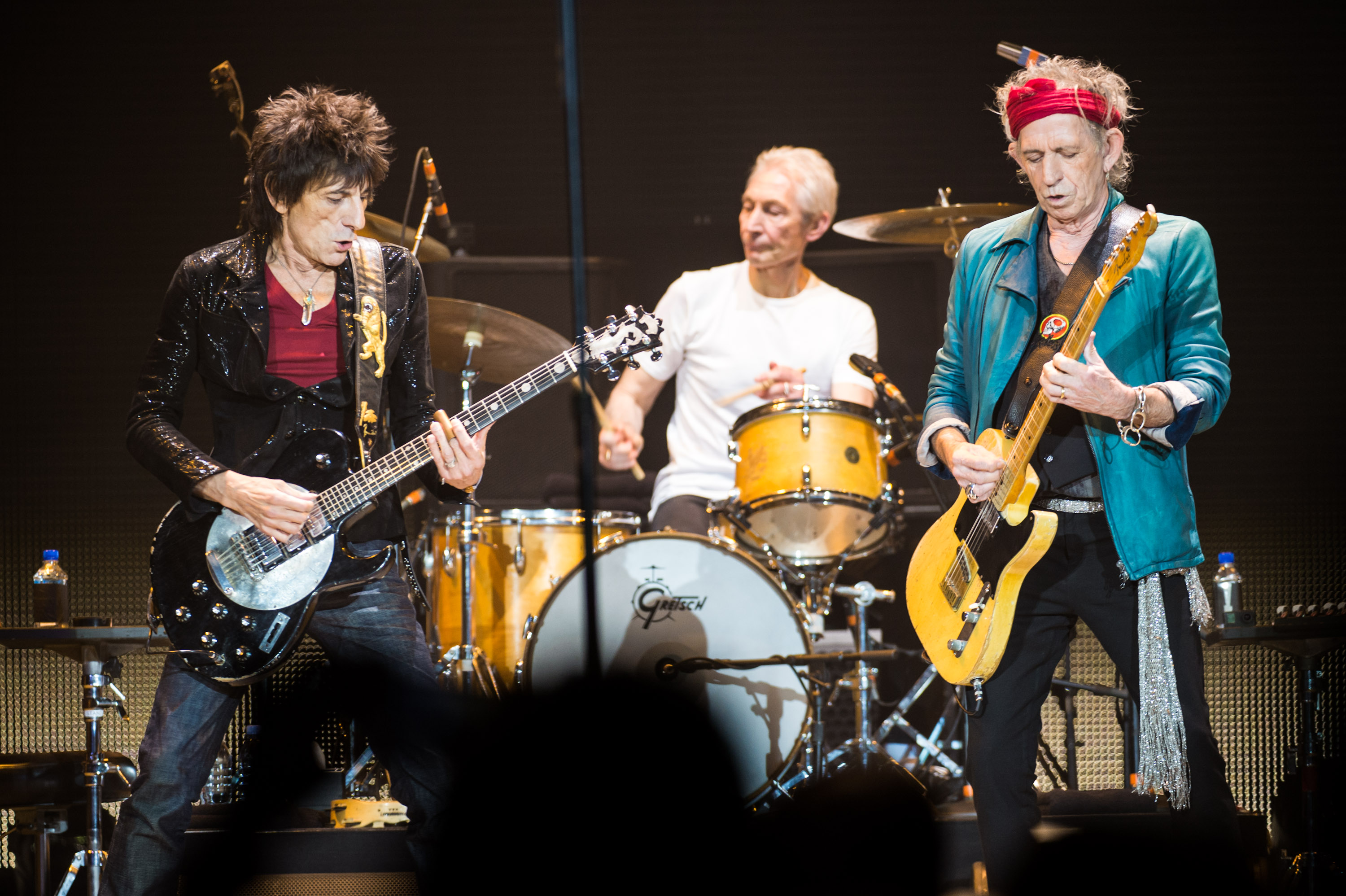 Charlie Watts, Keith Richards e Mick Jagger sul palco, 2012 (Credits: Ian Gavan/ Getty Images)
