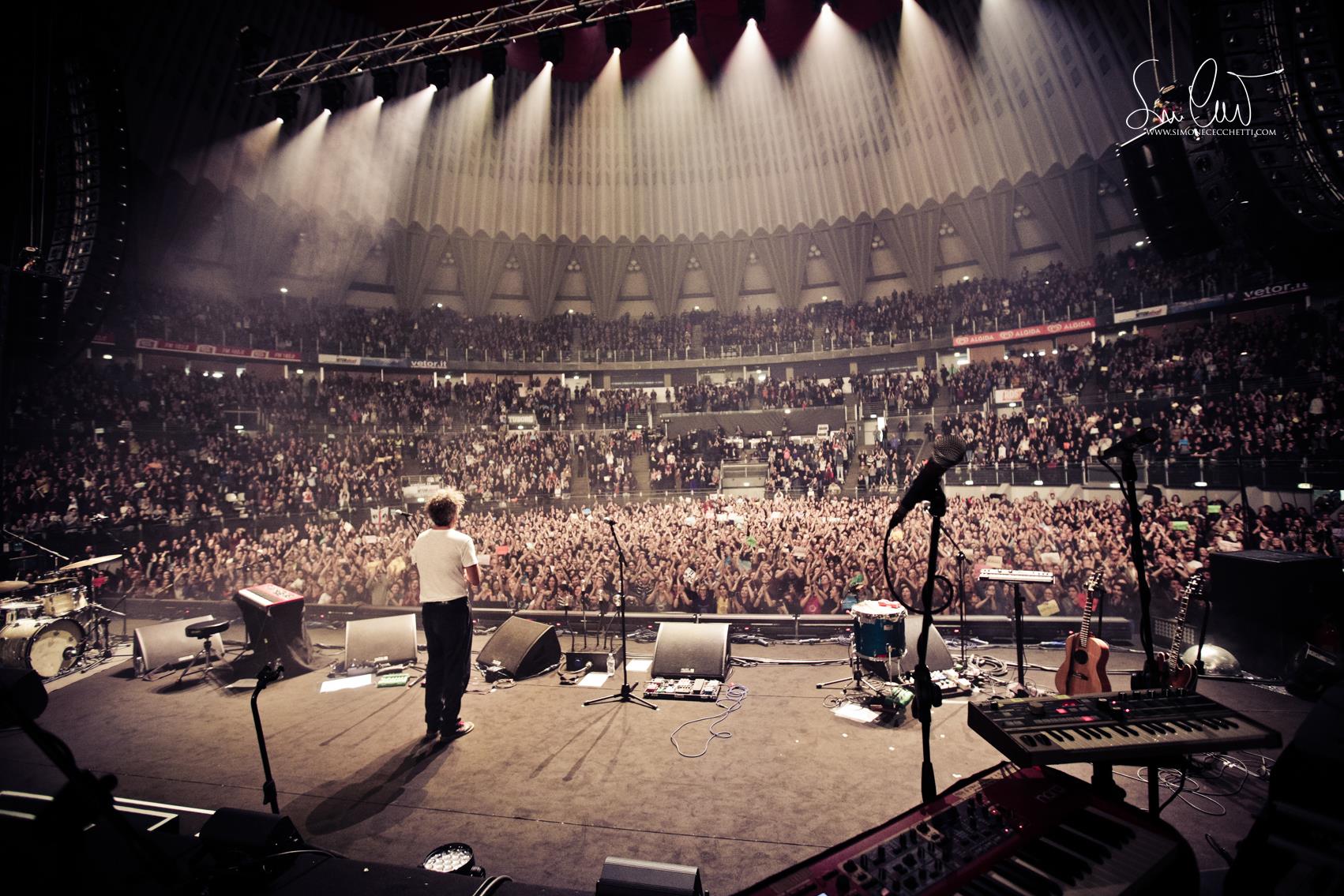 L’inizio del concerto è affidato a Una somma di piccole cose, Filosofia agricola ed Evaporare, interrotte più volte da applausi a scena aperta, che rivelano subito la compattezza del sound della sua band (Alberto Bianco, Filippo Cornaglia, Damir Nefat e Matteo Giai), mentre due grandi schermi ai lati del palco trasmettono filmati a tema con i brani.