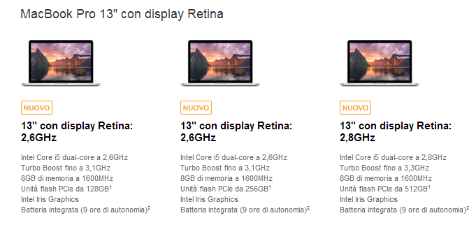 Se vi apprestate ad acquistare un MacBook Pro Retina, allora sappiate che sul sito di Apple sono già disponibili le versioni “aggiornate”. Precedentemente diffusa dal sito Chongqing China Store , l’immagine che ritrae le specifiche tecniche dei nuovi portatili di Cupertino è divenuta realtà anche da noi . Quello che salta all’occhio è il passaggio della memoria RAM da un minimo di 4 GB ad uno di 8 GB per il modello da 13 pollici e da 8 GB a 16 GB per quello da 15 pollici.