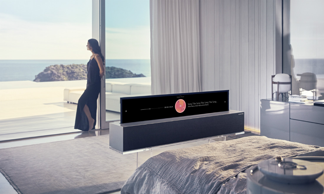 A giocare con le forme è pure la coreana LG, con il suo tv Oled dallo schermo arrotolabile. Il pannello sa svanire dentro la sua base, lasciando tutto lo spazio a una possente soundbar con Dolby Atmos a 4.2 canali: un sistema hi-fi condensato in un’unica, totemica superficie in alluminio. «Oppure si può far uscire solo una porzione del display, su cui controllare il meteo e l’ora o leggere le informazioni del brano che stiamo ascoltando» racconta Sergio Buttignoni, corporate marketing director di LG Italia. Questo televisore, assieme a molti altri dell’azienda svelati a Las Vegas, va oltre: sfrutta un algoritmo con cui è equipaggiato per regolare in autonomia le sue impostazioni sonore in base all’ampiezza della camera nella quale viene piazzato. Un po’ come se un solerte tecnico dell’audio sia venuto fino a casa per ottimizzarne le prestazioni.