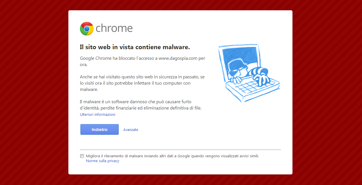 Se fosse stato vero saremmo dinanzi ad un comportamento da bavaglio del web mai visto prima. Quando una schermata rossa ha bloccato ieri i navigatori diretti al sito/blog di Roberto D’Agostino la rete (una fetta molto piccola) è entrata in ansia. Bloccano Dagospia perché scrive roba forte? Gli articoli hanno dato fastidio a qualcuno? Questi gli interrogativi che capeggiavano ieri tra forum e social network. Purtroppo, anzi per fortuna, non è così. Lo scanner automatico di Google analizza ogni giorno la presenza di codice maligno all’interno del web, non sotto richiesta di semplici utenti ma direttamente dagli amministratori di sistema. Come si legge dalle pagine di supporto per i webmaster di Google: “I sistemi automatici di Google eseguiranno la scansione del tuo sito web. Se non rileviamo malware, rimuoveremo l’avviso dal tuo sito. Questa procedura potrebbe richiedere circa un giorno; puoi verificare lo stato della tua richiesta in Strumenti per i Webmaster nella pagina Malware della sezione Condizione”.