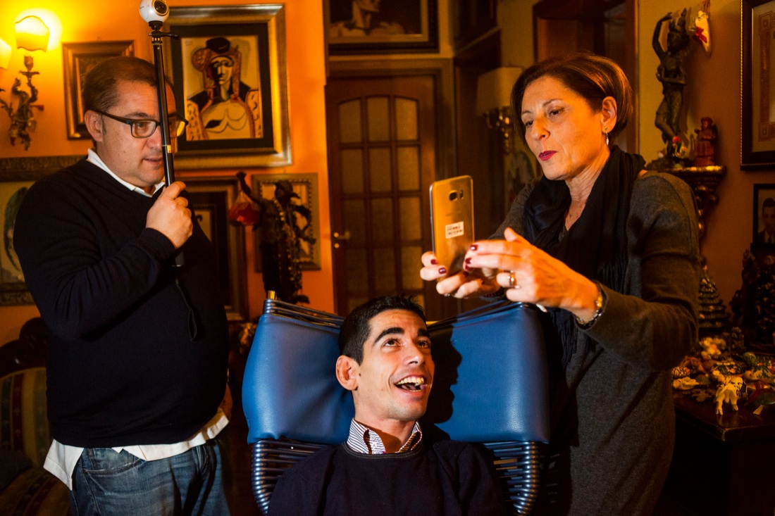 Danilo nel salone di casa sua assieme alla sua educatrice Maria Stella Accolla ed il giornalista Guido Castellano mentre provano le funzionalità di una videocamera collegata al cellulare Samsung