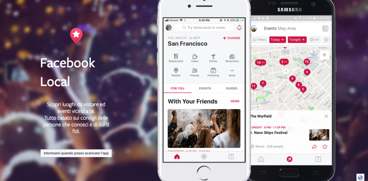 Facebook Local è un’applicazione scaricabile gratuitamente che sarà accessibile anche da chi ha deciso di cancellarsi da Facebook. È già disponibile sia su IOS che su Android e permette di scoprire eventi in base a dove ci troviamo.
