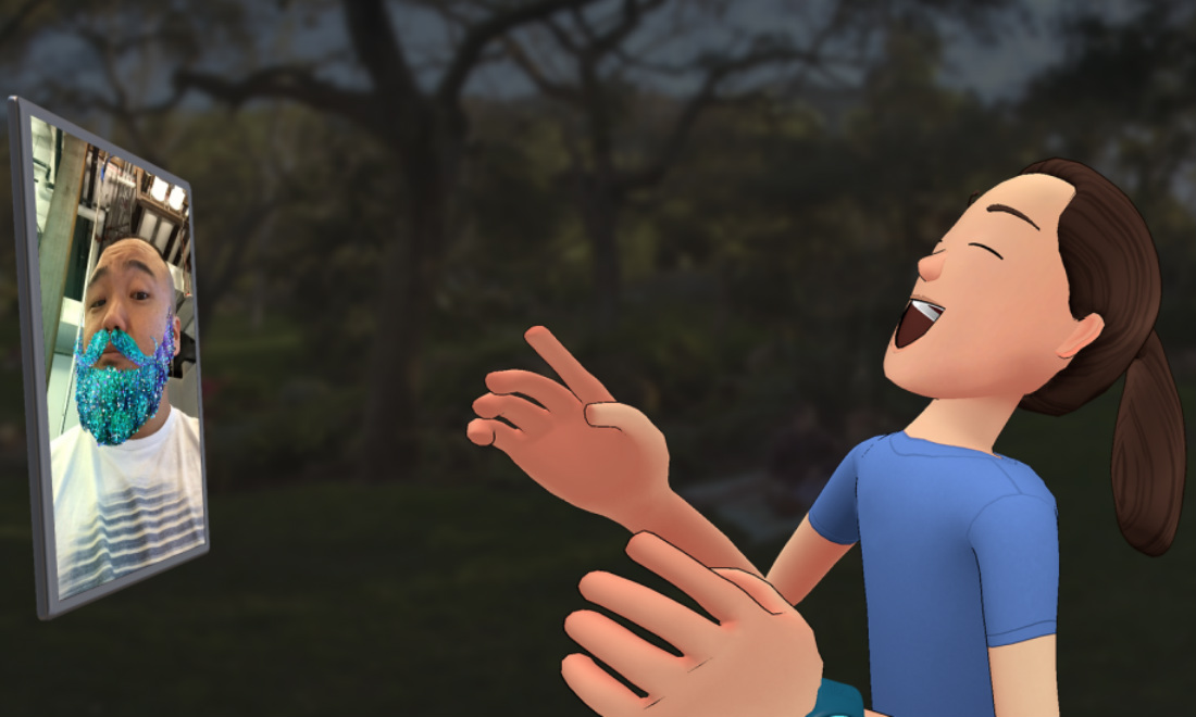 Ogni utente intorno al tavolo, oltre all’avatar, ha il suo nome e la sua foto profilo di Facebook sulla testa così è più facilmente riconoscibile. Altri possono essere invitati a partecipare, sia tramite visore, sia con una videochiamata su Messenger (immagine sopra), che si apre nell’ambiente e diventa una sorta di ponte, di punto di collegamento tra l’universo tradizionale e quello parallelo generato da Spaces.