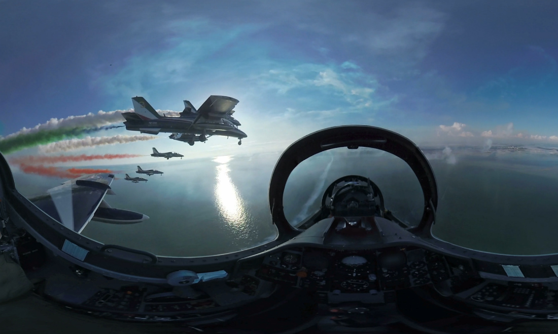 Siamo abituati a guardarle dal basso verso l’alto, con il naso all’insù, storditi e rapiti dalla loro colorata velocità. Ma oggi, complice la tecnologia, la prospettiva cambia, sale in quota: possiamo vivere la piacevole illusione di essere noi stessi a bordo delle Frecce Tricolori, la spettacolare pattuglia acrobatica nazionale. Non con un filmato qualunque, da semplici spettatori passivi, ma tramite coinvolgenti video a 360 gradi che permettono di scegliere angolazioni, dettagli, inclinazioni del punto di vista con un banale tocco delle dita. Come pilotare, o quasi, in tutte le direzioni.