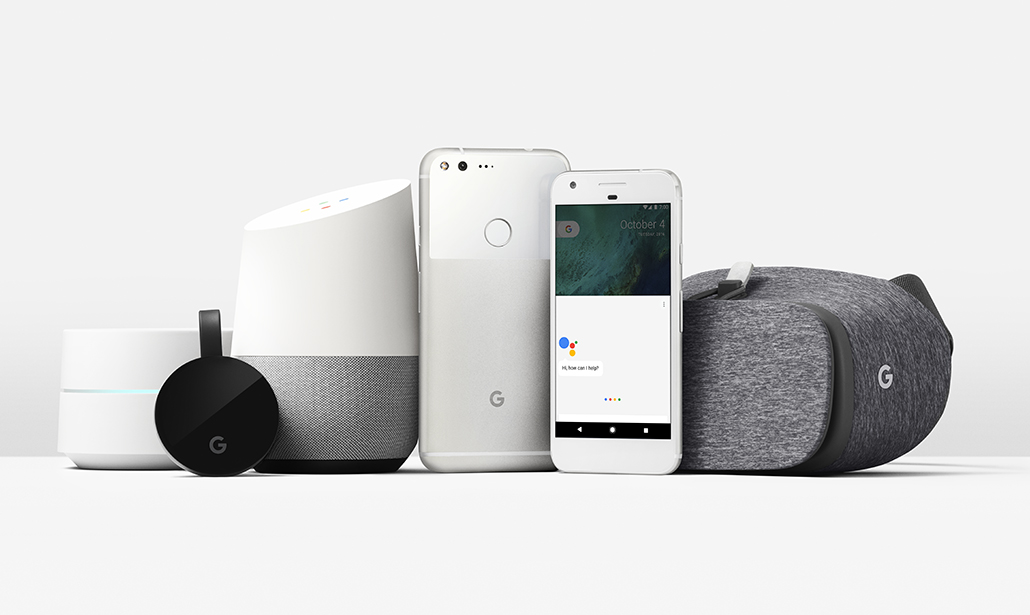 Da sinistra a destra: Google Wi-Fi, Chromecast Ultra, Pixel XL, Pixel, Daydream View,.
