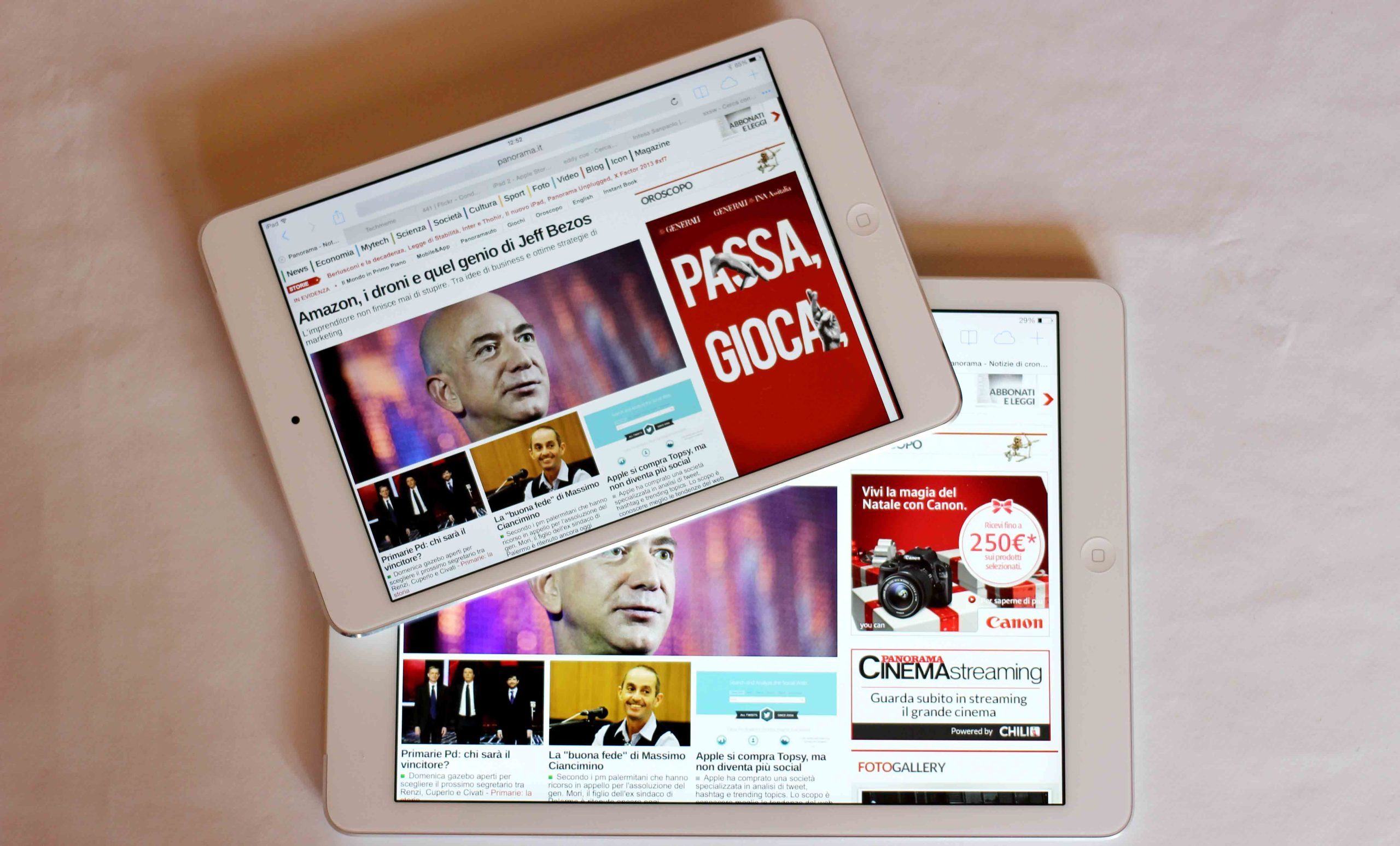 La presenza di un display Retina garantisce ad entrambi i dispositivi una qualità d’immagine molto elevata. Anzi, sul piano squisitamente tecnico, il display dell’iPad Mini avendo una superficie minore da coprire può garantire una maggior densità di pixel. Ma sul piano della pura esperienza d’uso, l’iPad Air è decisamente più gratificante. Il motivo? Lo stesso per cui un TV da 40 pollici è più cinematografico di uno da 30 pollici.