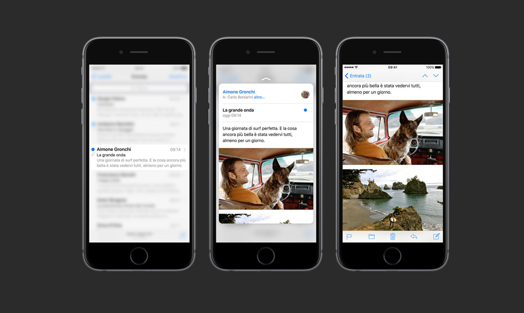 EMAIL – Nell’apllicazione Mail è possibile premere leggermente su un messaggio per avere un’anteprima del contenuto (che apparirà in una nuova finestra, sovrapposta all’elenco dei messaggi); con una pressione più forte, invece, si ha accesso al messaggio completo, che apparirà come fosse aperto direttamente dalla casella di posta in arrivo.