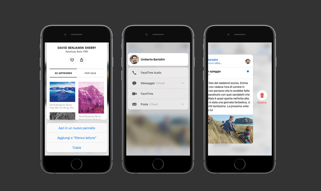 Ma cosa è possibile fare, in concreto, con il 3D Touch? Apple parla di due specifiche declinazioni del sistema: da un lato c’è la possibilità di dare un’occhiata rapida a un contenuto senza bisogno di doverlo aprire (peek), dall’altro l’accesso completo allo stesso (pop). Scrollando la casella di posta elettronica, ad esempio, è possibile premere leggermente su un messaggio per avere un’anteprima (il contenuto dell’email comparirà in una nuova finestra, sovrapposta all’elenco dei messaggi), oppure aprirlo completamente operando con una pressione più forte sul vetro.