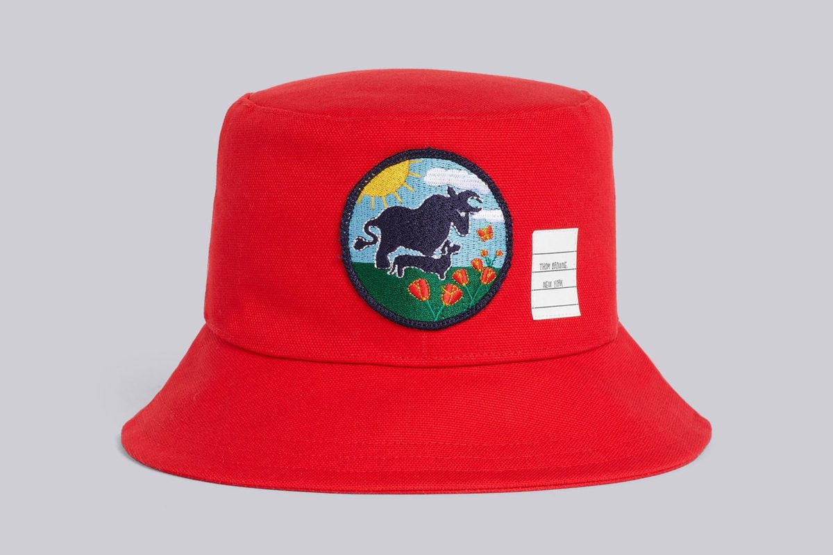La collezione di Thom Browne ruota attorno al colore rosso, simbolo di fortuna e gioia nella cultura cinese. Il «bucket hat» di cotone carminio viene arricchito da un patch circolare che rappresenta il Bue, l’animale simbolo del nuovo anno.