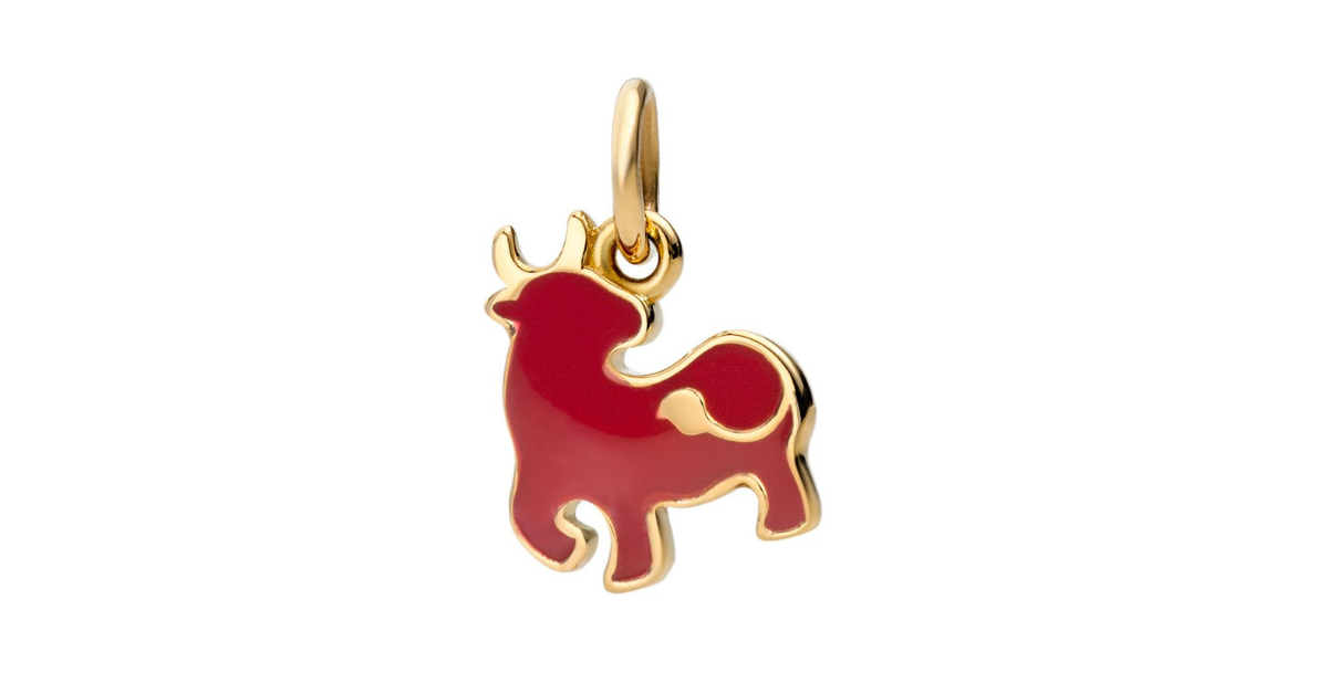 La tradizione Dodo continua con un nuovo charm a forma di bue. L’animale in oro giallo 18K è arricchito da una vivace finitura in smalto rosso riconosciuto come simbolo di fortuna, gioia e felicità.