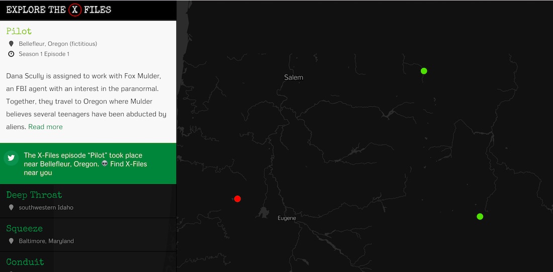 Appassionati di X-Files? Allora passerete delle ore su questa mappa, solo per rivivere tutti i luoghi visitati da Mulder e Scully in tutte le stagioni della serie del mistero.