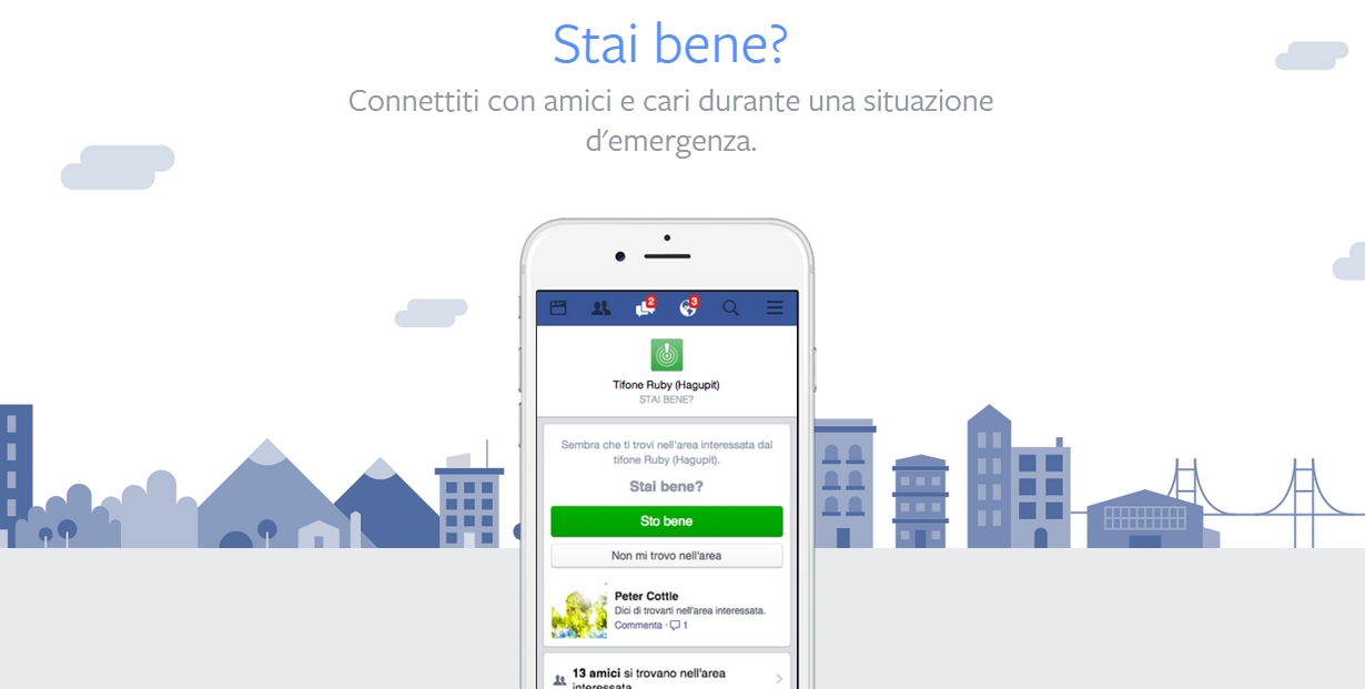 Anche Facebook ha attivato un servizio analogo, lanciato lo scorso anno e chiamato Safety Check. L’approccio è diverso e, forse, più efficace: se a Facebook risulta che abiti (o ti ritrovi in questo momento) nell’area colpita dal terremoto, il sistema Safety Check ti invia una notifica (“Sembra che ti trovi nell’area colpita dal terremoto”) seguita dalla domanda “Stai bene?” a cui puoi rispondere in due modi: “Sì” oppure “Non mi trovo nell’area.” Allo stesso tempo, se qualche tuo contatto si trova nell’area, il tool ti informerà se ha risposto positivamente al questionario e se è dunque al sicuro.