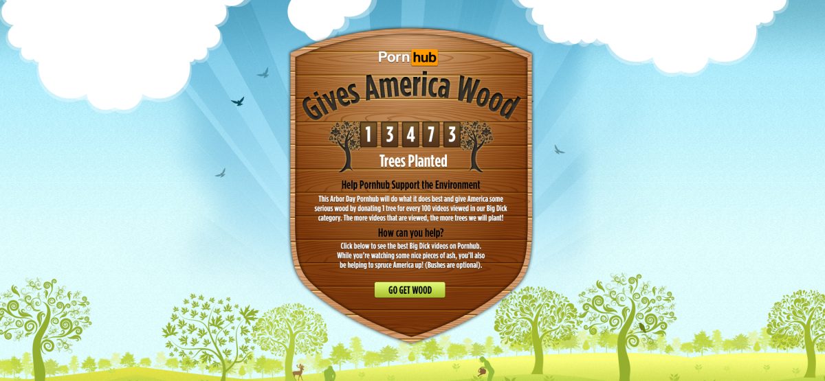 Sarà anche per questo che PornHub – uno dei servizi più celebri nel mondo del Web a luci rosse – ha lanciato un’iniziativa che si potrebbe quasi definire “etica”: alberi in cambio di visualizzazioni online. Pornhub Gives America Wood , questo il titolo della campagna che gioca evidentemente coi doppi sensi, pianterà infatti sul territorio americano un albero ogni 100 filmati visualizzati nella categoria “Big Dick” (che potremmo tradurre elegantemente in “superdotati”).