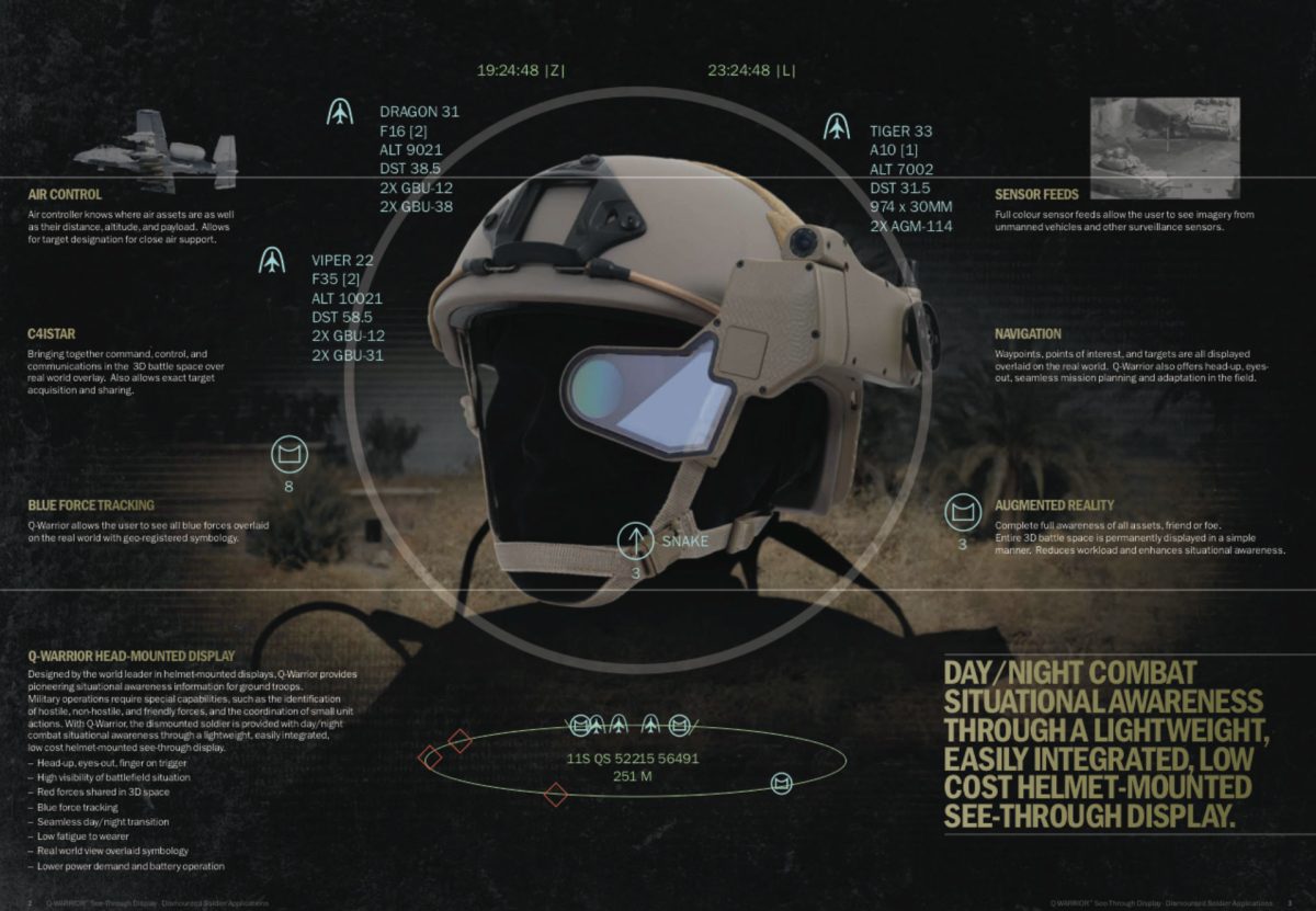 Q-Warrior consentirebbe di integrare il soldato del futuro in una rete di informazioni che lo trasformerebbe in una sorta di super-soldato capace di sfruttare lo schermo laterale del suo elmetto per misurare distanze, ottenere feedback video da un drone, visualizzare la planimetria 3D interna di un edificio e, soprattutto, avere notizie in tempo reale su cosa stia succedendo nella zona (se, ad esempio, al di là di una montagna sono schierate delle truppe nemiche).