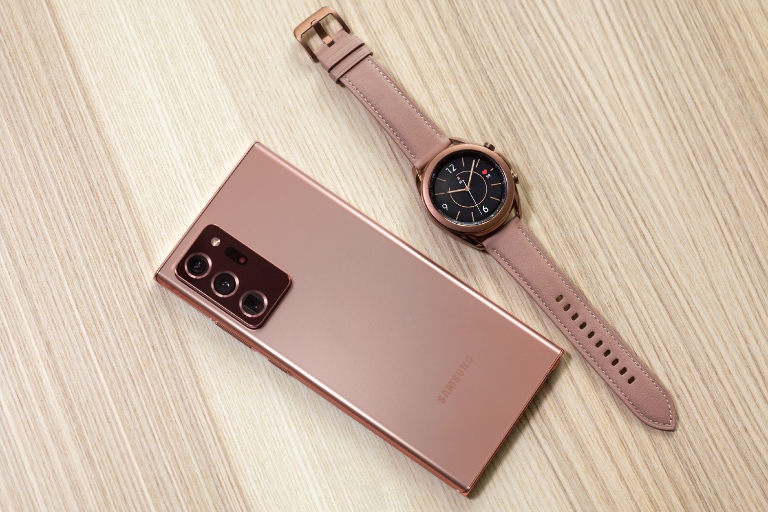 Rimanendo nel terreno dell’abbondanza dei display, al Galaxy Note20 Ultra 5G abbiamo potuto abbinare per un po’ l’ultimo smartwatch della casa coreana, il Watch3. Li vedete avvinghiati qui sopra mentre si scambiano un po’ di carica (perché, nota a margine, lo smartphone all’occorrenza è pure un power bank wireless).