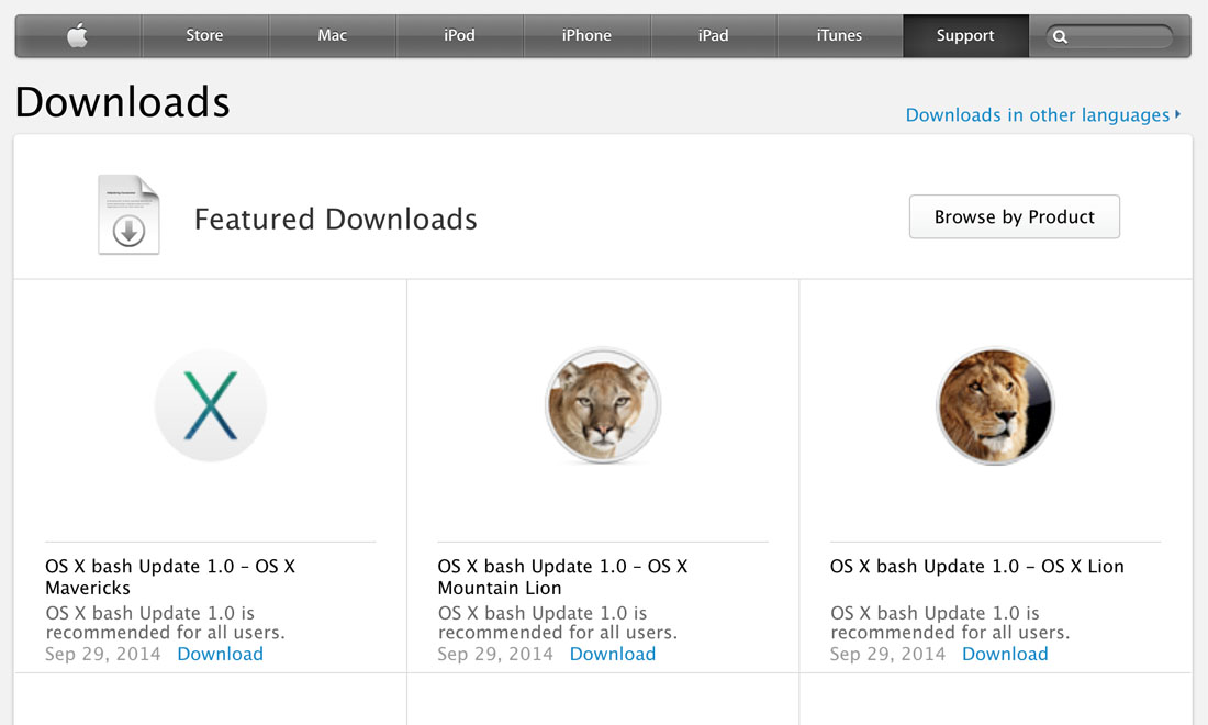 Bash Update 1.0 è disponibile per l’ultima versione di OS X, 10.9 Mavericks e per le due precedenti, la 10.8 Mountain Lion e 10.7 Lion, che risale al 2011. I software, che pesano circa 3,5 MB ognuno, non sono (per ora) forniti attraverso il consueto aggiornamento software via Mac App Store, ma si scaricano dalla sezione Supporto del sito statunitense di Apple.