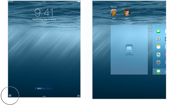 Per visualizzare l’icona dell’attività da riprendere occorre scorrere verso l’alto dal bordo inferiore sinistro del blocco schermo sul secondo dispositivo iOS oppure andare nel display multitasking premendo due volte il tasto Home e toccare l’app condivisa. Sul Mac. l’icona dell’app Handoff viene visualizzata nel Dock o, in alternativa, premendo Comando-Tabulatore per passare a un’app con un’icona Handoff.