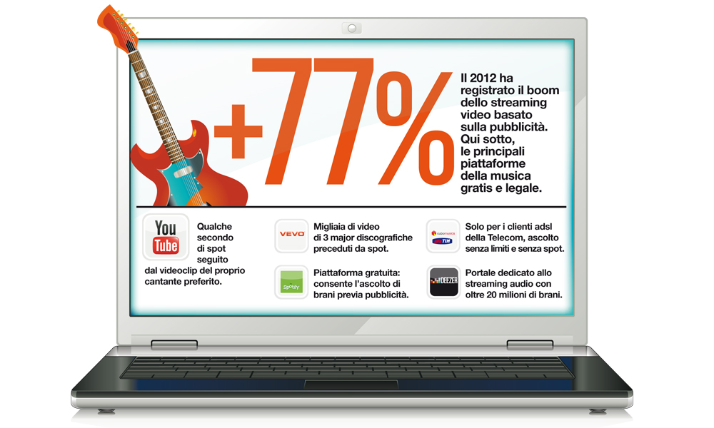 Tempi duri per i pirati della musica. Dopo anni di download illegale e senza regole, il mercato «sembra avere trovato le contromisure efficaci per debellare o quantomeno ridurre significativamente il fenomeno» sintetizza Enzo Mazza, presidente della Federazione industria musicale italiana. «Oltre alla chiusura e al blocco dei portali che consentono di rubare canzoni, si sono rivelati decisivi i nuovi modelli di business». In particolare, a riportare la fruizione di musica nei confini della legge contribuisce un dato clamoroso, ovvero il boom dello streaming video basato sulla pubblicità (più 77 per cento nel 2012). In pratica, l’ascolto libero e legale di una canzone (su Youtube, per esempio) è legato alla visione e all’ascolto di un breve spot.