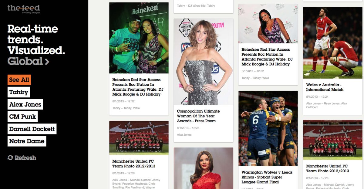 Una risposta al quesito ce la fornisce Getty Images con The Feed, una sorta di istantanea multi-fotografica sulle tendenze social. Il servizio, in pratica sfrutta l’integrazione software del sistema Connect API per distallare dallo sterminato archivio Getty Images (15 milioni di immagini online e altri 70 milioni di immagini d’archivio) gli scatti associati ai termini di tendenza provenienti da Twitter.