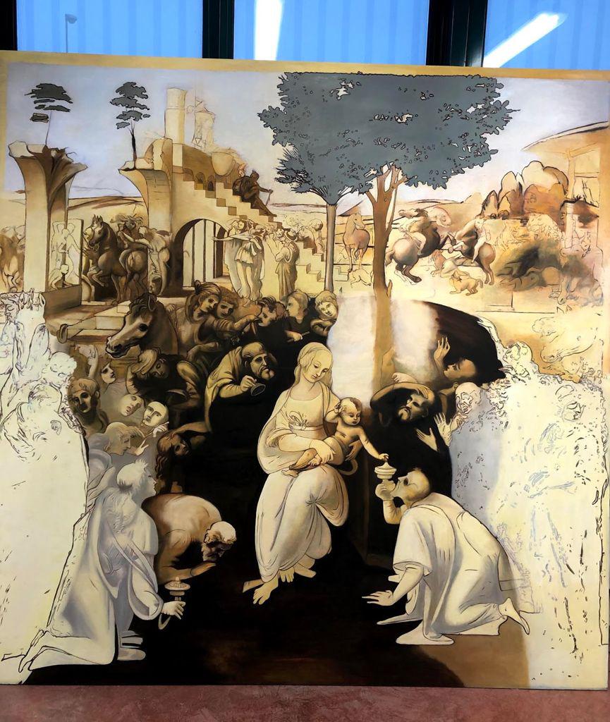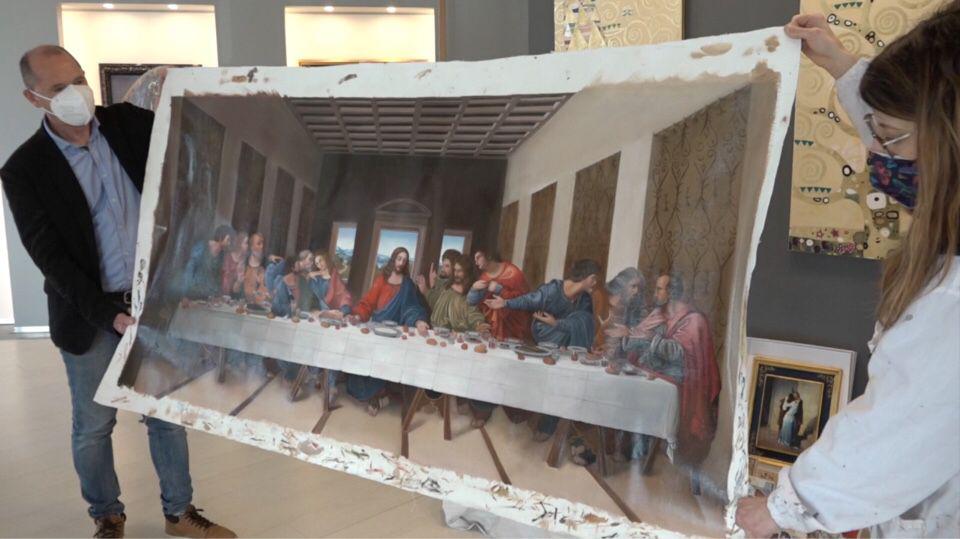 Dalla bottega artigiana al set televisivo: il pennello del maestro Stefano Lazzari ha colorato il successo del colossal dedicato al genio universale del Rinascimento. Oltre 140 metri quadri di pittura. La Bottega Tifernate ha realizzato i dipinti utilizzati nella serie tv a puntate Leonardo, in onda su Rai 1. Un lavoro durato un anno, in pieno lockdown, con l’impiego di tutto lo staff del celebre marchio tifernate delle riproduzioni d’autore di Stefano e Francesca Lazzari, per portare a termine opere uniche che hanno fatto da sfondo alla serie televisiva. Sono state ricreate tre opere in più copie ciascuna nella stessa misura dell’originale. In particolare, L’ultima Cena oltre 8 metri per 4, L‘adorazione dei pastori” e Il Battesimo di Cristo sempre in dimensione extra-large. «L’ultima Cena – spiega a Panorama Stefano Lazzari, titolare di un brevetto unico per questo genere di lavorazioni, non nuovo a performance cinematografico-televisive – è stata ricreata in affresco con la stessa tecnica utilizzata da Leonardo per l’originale. Abbiamo adoperato un supporto di alluminio alveolare, molto leggero e adatto per la lavorazione in affresco. E’ stata ricreata in tre fasi di lavorazione differenti».