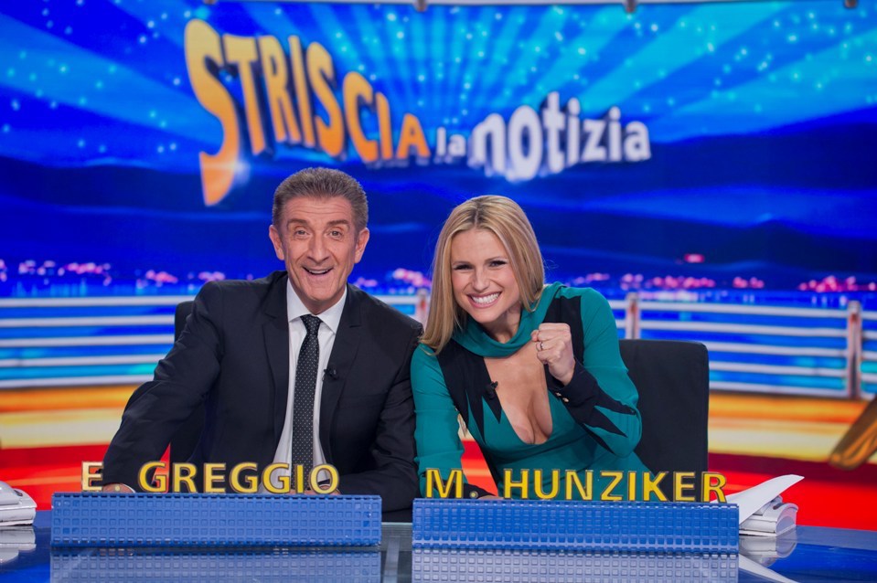 Michelle Hunziker ed Ezio Greggio insieme sul bancone di Striscia la Notizia