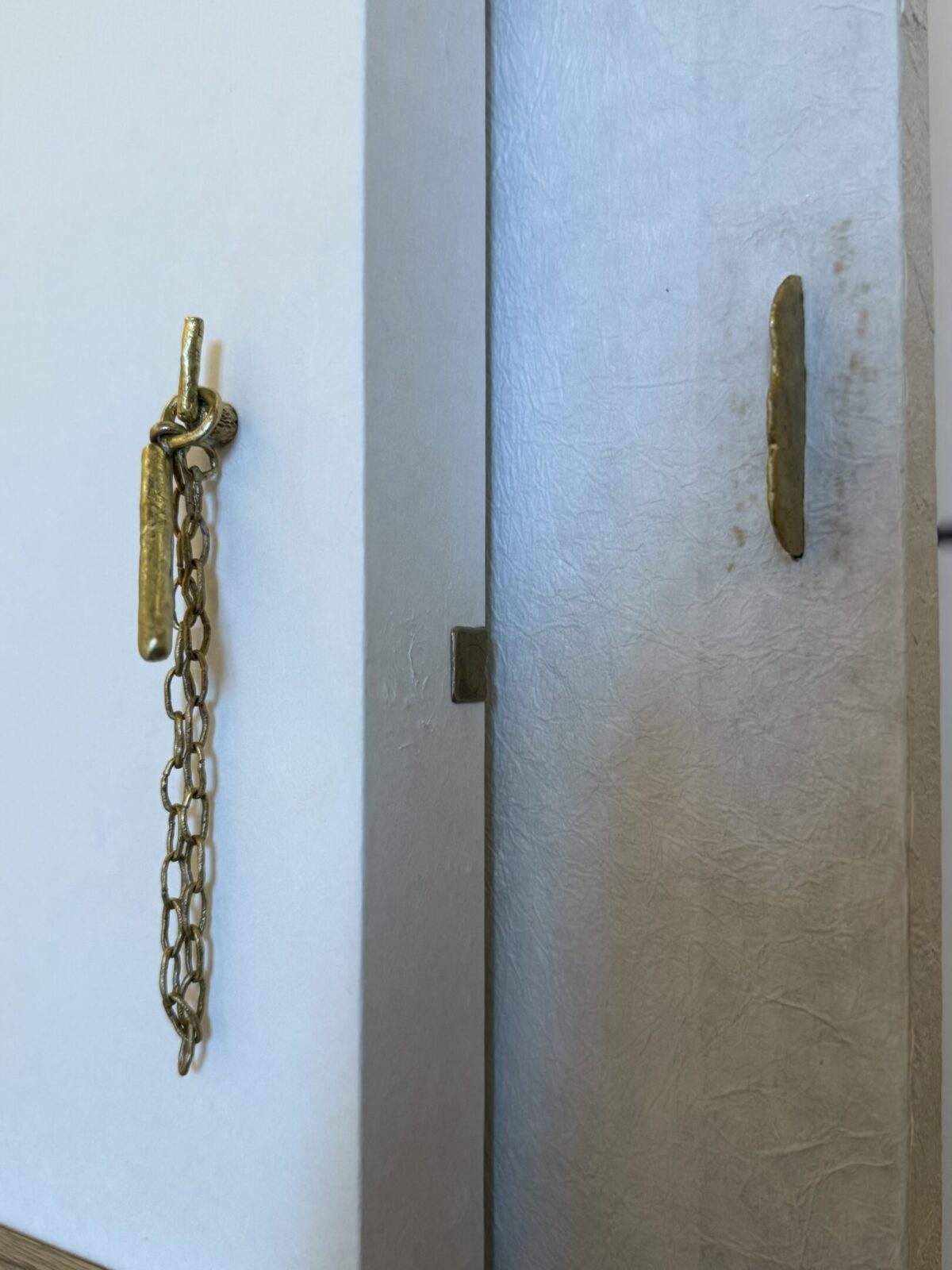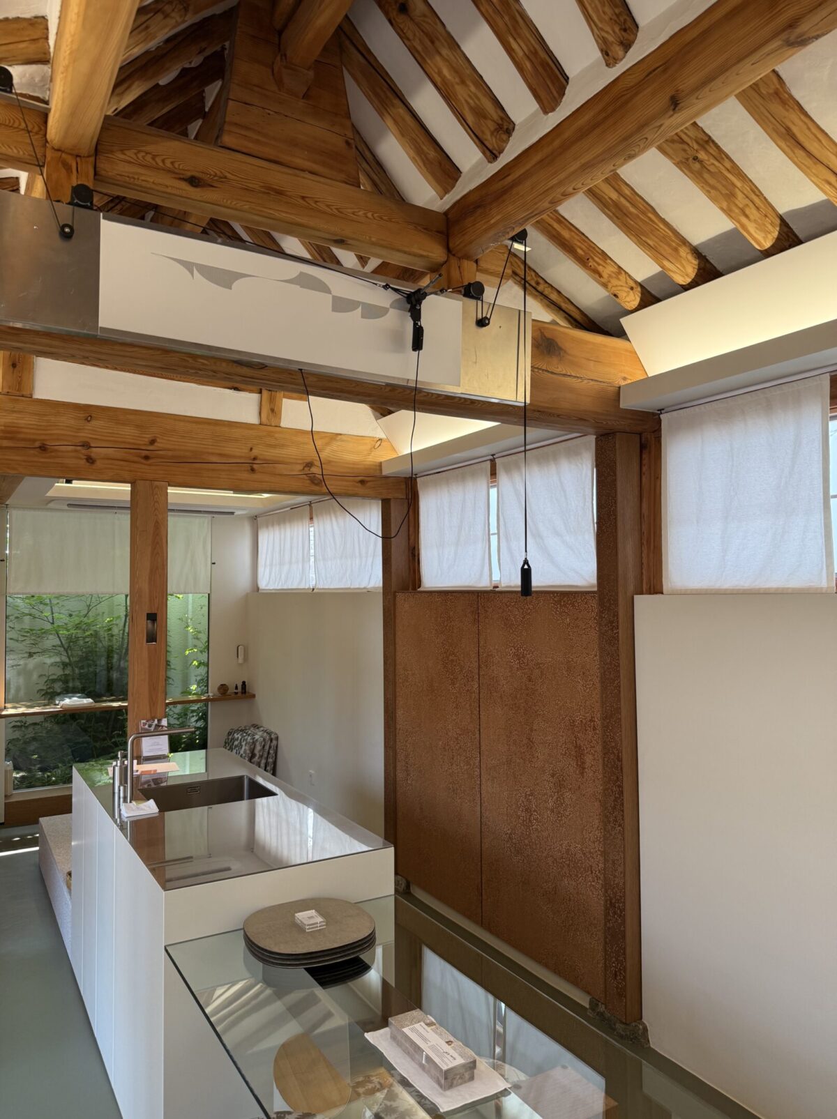 La casa è grande, oltre 200 metri quadri, con una zona giorno ampia e luminosa, stanze da letto protette da pannelli scorrevoli, bagni con vasche profonde in pietra levigata, un giardino interno con piccolo specchio d’acqua. Ma ciò che colpisce è la sensazione di essere in un luogo che esiste solo qui: una specie di galleria abitata, dove ogni dettaglio – un vaso, una trave, una fessura nella carta – parla il linguaggio dell’equilibrio.