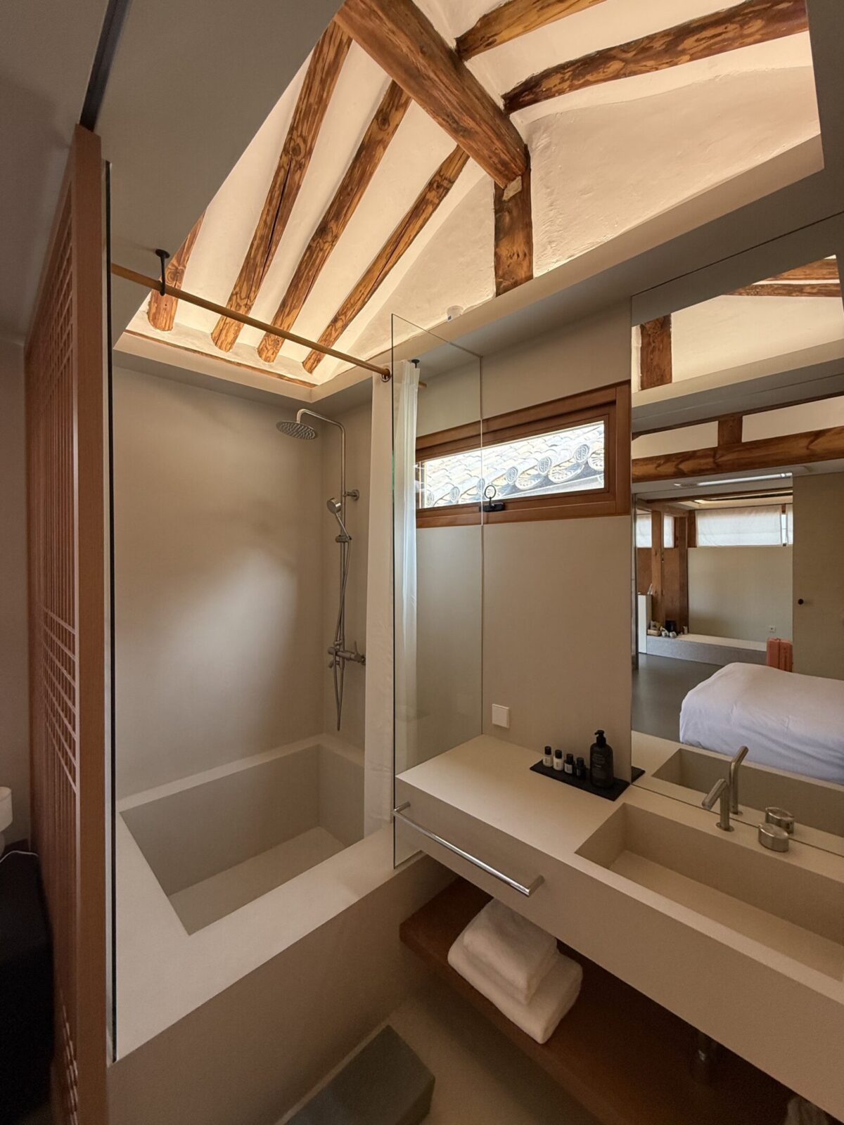 Il vero colpo d’ala del gruppo Nostalgia è aver intuito che la bellezza di Bukchon non può essere contenuta in un solo edificio. Il villaggio è già, in sé, un’opera diffusa. Così, invece di costruire un hotel classico, si è scelto di restaurare diversi hanok originali sparsi tra i vicoli, ognuno con una sua identità architettonica e narrativa. Le case non si vedono dall’esterno, non si riconoscono come stanze d’albergo. Sono case vere, vissute, immerse nel quartiere. Il check-in avviene in un piccolo centro discreto e moderno, poi ci si inoltra nei vicoli, e si entra nel proprio rifugio.
