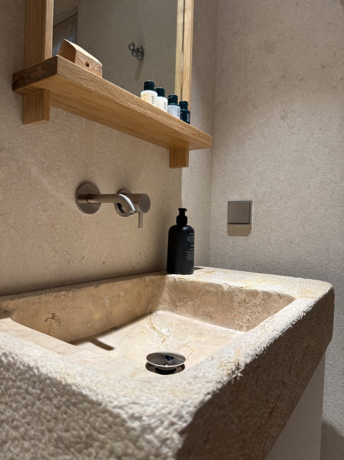La cucina è funzionale ma invisibile, pensata per vivere, non per esibire. Il bagno, intimo e rivestito di pietra chiara, ospita una vasca profonda, mentre i profumi che accompagnano gli ambienti – parte della collezione “Slow Jae scent” – evocano la terra, il legno e il tè.