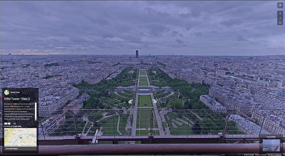 Tra i tanti viaggi virtuali proposti ai navigatori di tutto il mondo da Google Street View, questa settimana abbiamo scelto di provare la vista su Parigi dalla Torre Eiffel , il monumento più famoso della capitale francese, conosciuto in tutto il mondo come suo simbolo. La torre, costruita nel Campo di Marte come arco di entrata dell’Esposizione universale del 1889, nella sua storia è stata visitata da più di 250 milioni di persone, divenendo il monumento a pagamento più visitato a livello mondiale. Alla “La Dame de fer”, che è anche l’edificio più alto di Parigi, anche il Google Institute ha dedicato molta attenzione, proponendo tra l’altro 4 viaggi per immagini nella sua storia.