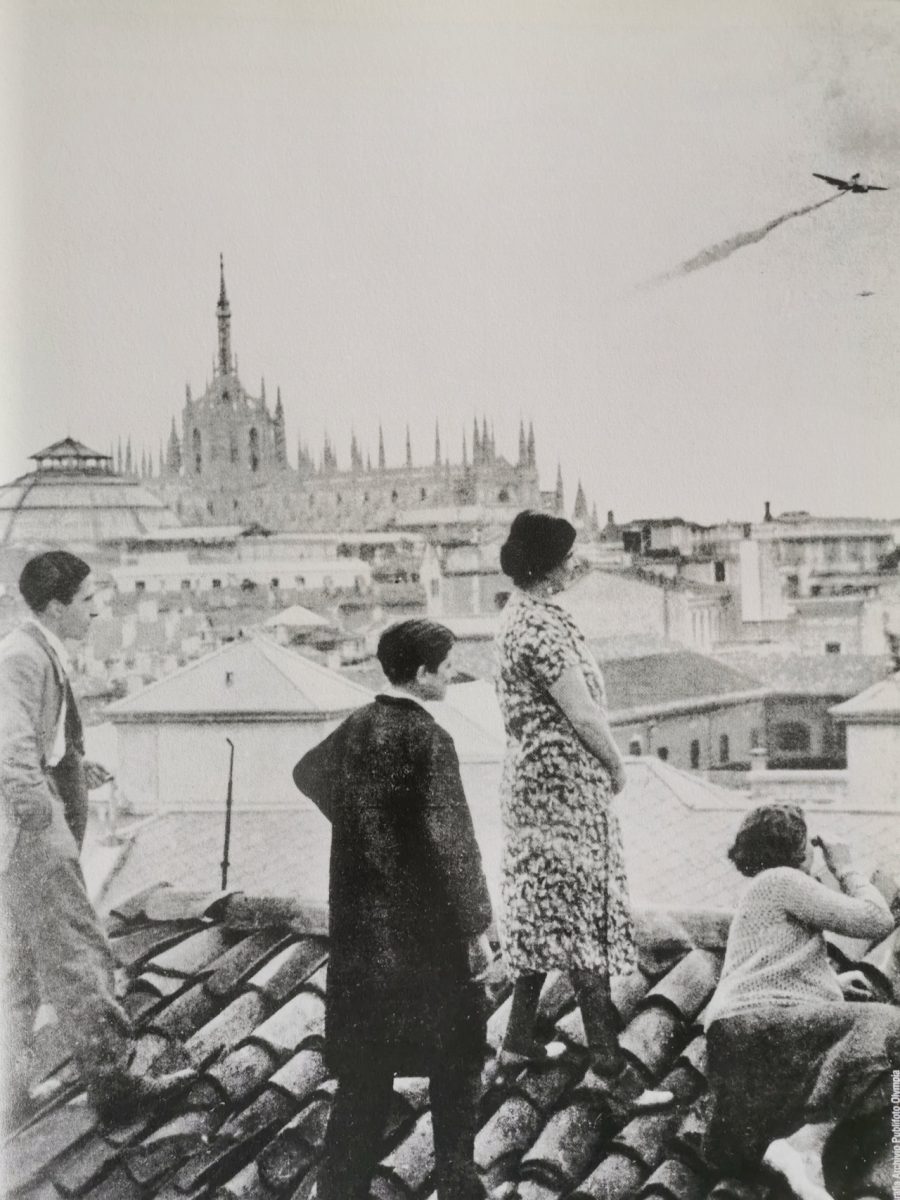 Dai tetti delle case, i milanesi seguono le manovre dell’aviazione; (Archivio Publifoto Olympia/Città1999)
